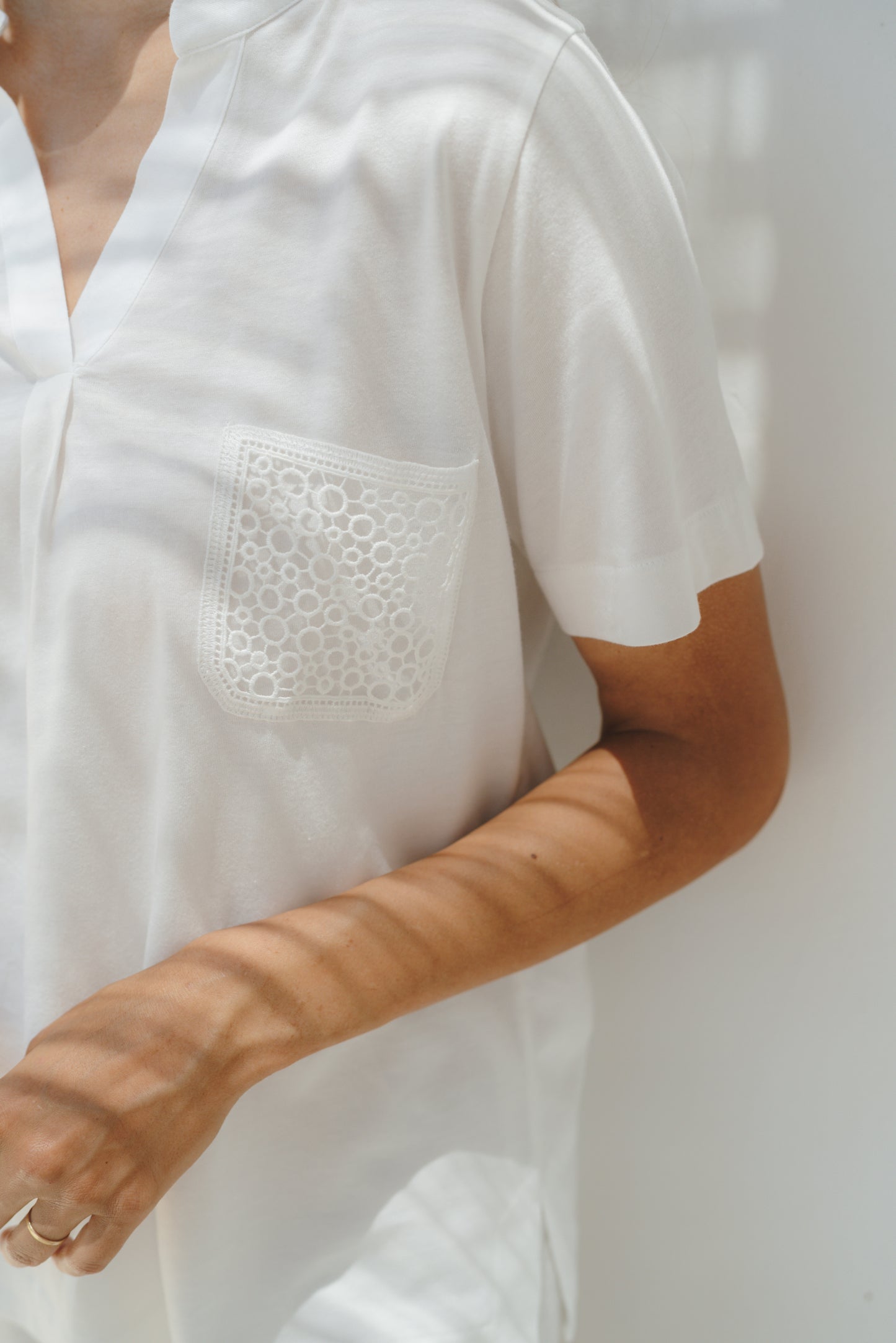 - design: V-neckline with small pleats in the front and the back of the top, short sleeve design, mid-rise short and "guipure" lace pocket (made in France)