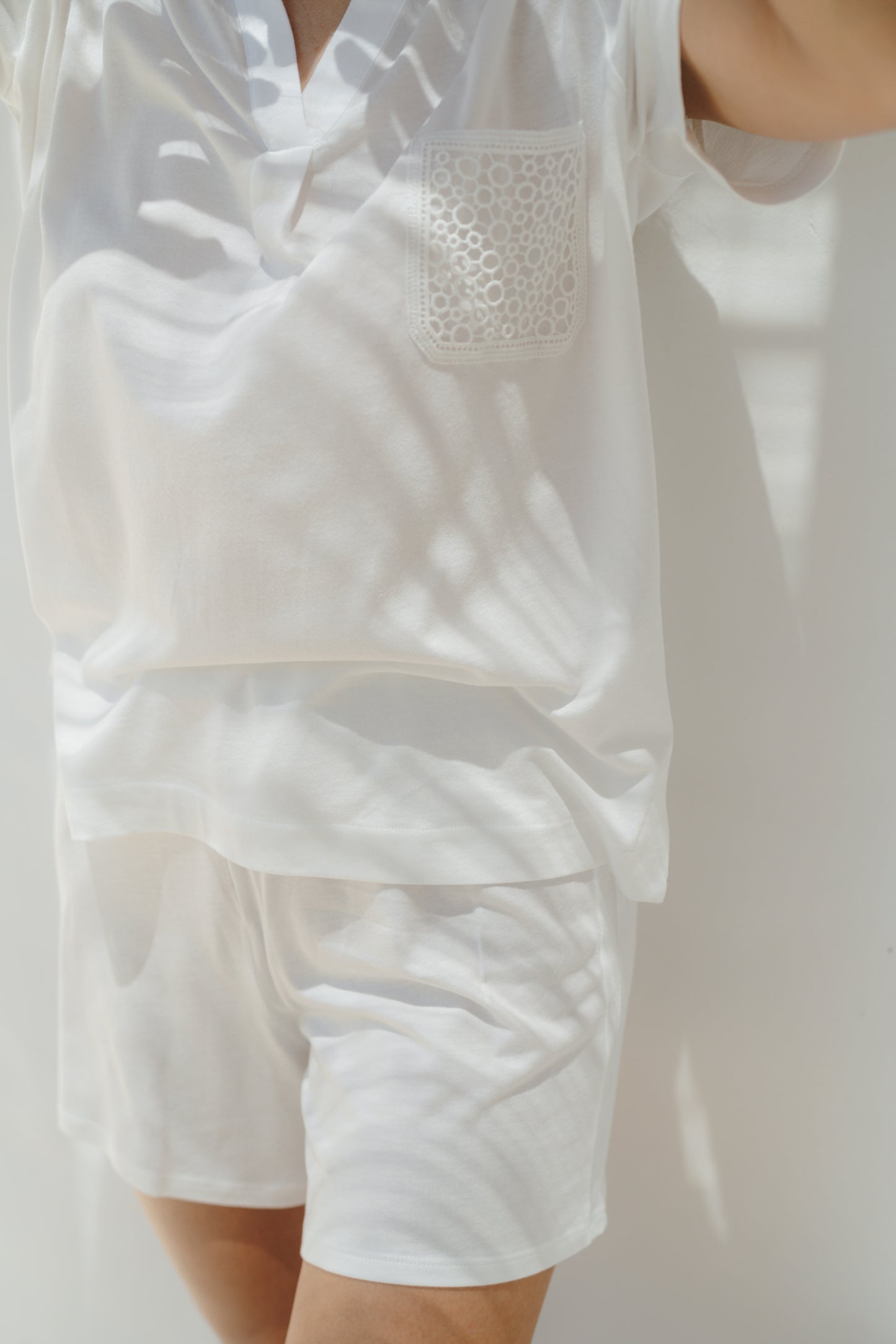 Regular price €27,80Our Helena collection is lightweight, breathable and extra fun. This luxurious Italian organic cotton is softer-than-soft. It's verified by OEKO-TEX® Standard 100, meaning our fabric is processed without harmful chemicals and dyes in a mill that uses safe and non-toxic dyes. It features a V-neckline with small pleats in the front and the back of the top, short sleeve design, mid-rise short and "guipure" lace pocket (made in France). It's a cozy, relaxed top & short where you will want to live in.